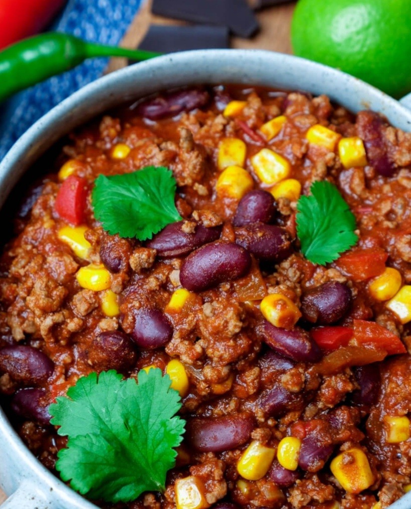 Kurz vor Ende der Garzeit Bohnen und Mais aus der Dose befreien, gründlich abspülen und zufügen. Diese nur kurz wenige Minuten mitgaren. Anschließend alles noch einmal abschmecken. |