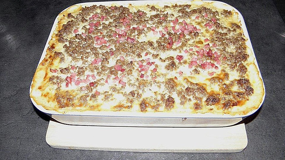 Eine Auflaufform leicht buttern und mit der Hälfte des Kloßteiges auskleiden. Kloßteig, dann Sauerkraut und dann Hack mit Lauch zweimal wie Lasagne einschichten.