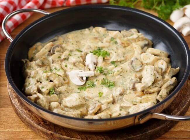 Das Hähnchenfleisch in die Soße geben und darin 1–2 Minuten ziehen lassen. |
