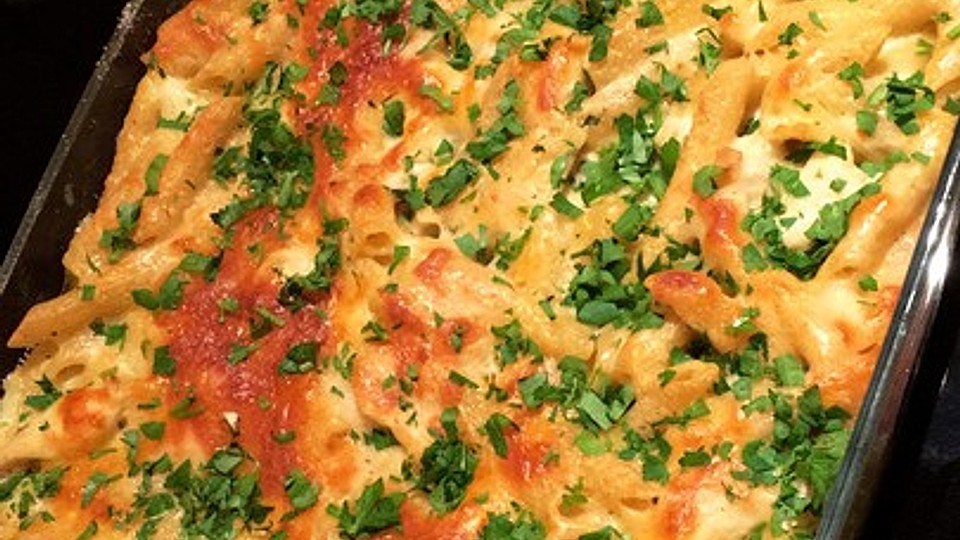 In einem großen Topf ausreichend Olivenöl heiß werden lassen und den Knoblauch zusammen mit der Hähnchenbrust anbraten. Mit Salz und Pfeffer würzen und ca. 5 min lang weiterbraten. Als nächstes die Gemüsebrühe zusammen mit der Kochsahne und den Nudeln in den Topf geben.