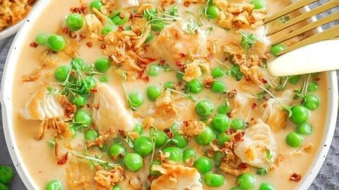 Tomatenmark, Röstzwiebel, Senf und Erbsen zugeben, mit Salz und Pfeffer abschmecken und nochmals 5 Minuten köcheln lassen.