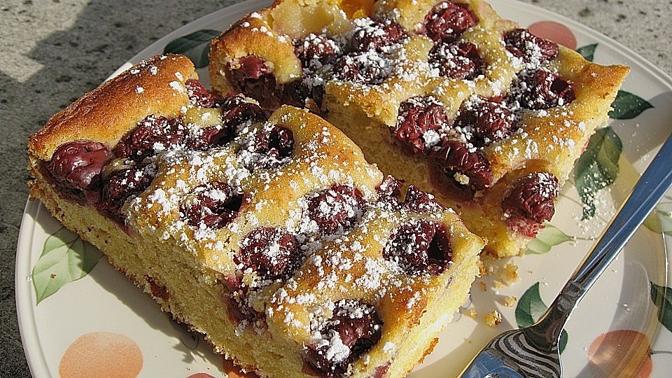 Die Kirschen abtropfen und den Saft dabei auffangen. Butter, Zucker, Vanillinzucker und Salz cremig rühren. Die Eier nach und nach unterrühren. Mehl und Backpulver vermischen und abwechselnd mit 150 g Joghurt unterrühren. Die Kirschen unterheben. Teig in eine gefettete Form geben und glatt streichen. Im vorgeheizten Backofen (E-Herd: 175°C / Umluft: 150°C) ca. 1 Stunde backen. Ca. 10 Minuten in der Form ruhen lassen. Auf ein Gitter stürzen, auskühlen lassen. Puderzucker und 50 g Joghurt glatt rühren. Ca. 4 EL vom Guss abnehmen, 1 EL vom Kirschsaft unterrühren. Weißen Guss auf dem Kuchen verteilen, rosa Guss in Streifen darüber laufen und trocknen lassen. Wer keinen Guss mag: Schön mit Puderzucker bestäuben. |