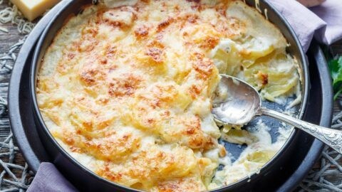 Die Sahne-Frischkäse-Masse gießt Du nun gleichmäßig über die Kartoffelscheiben und verteilst die 20 g Butter in Flöckchen darüber. Die 100 g Emmentaler reibst Du frisch mit einer Reibe und verteilst ihn ebenfalls gleichmäßig auf den Kartoffeln und in den Ofen.