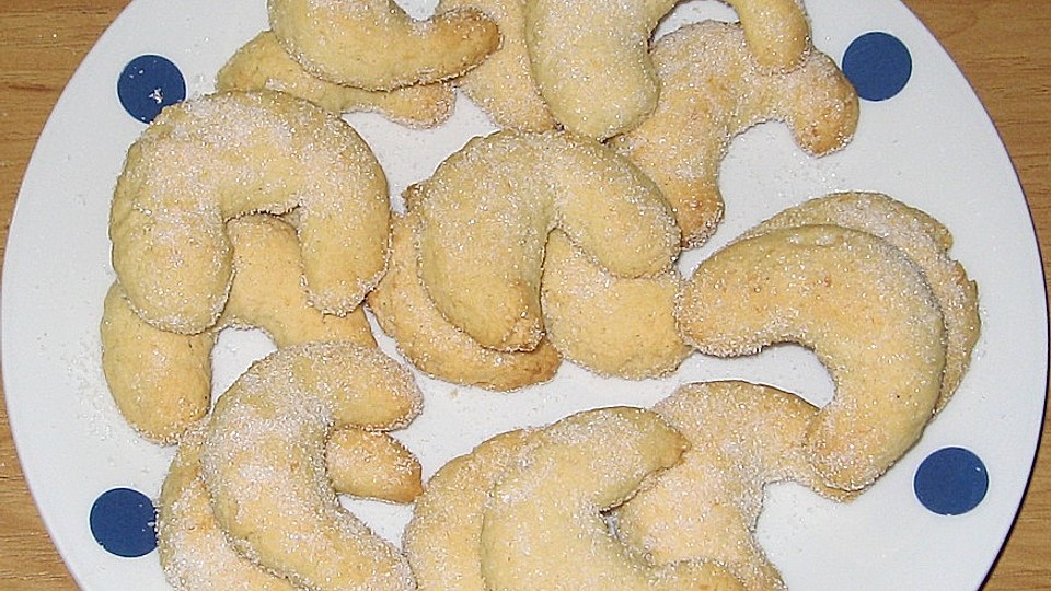 Während der Backzeit die 50 g Zucker und die 4 Päckchen Vanillezucker in einer Schale gut vermischen. Jetzt werden nur noch die fertigen Kipferl in dem Vanillezucker-Zucker-Gemisch gewendet und zum abkühlen beiseite gelegt.