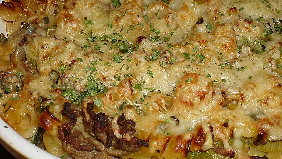 Öl in einer Pfanne erhitzen. Hackfleisch mit Knoblauch und Lauchringen krümelig braten. Nudeln abgießen und zusammen mit dem Rinderhackfleisch, Lauchringen und der Sauce in eine Auflaufform geben. Mit Salz und Pfeffer noch einmal abschmecken und auf mittlerer Schiene im Backofen backen.