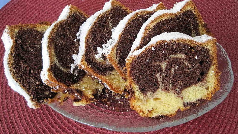 Mehl und Backpulver vermischen und abwechseln esslöffelweise mit der Milch einrühren (nur so viel Milch verwenden, dass der Teig schwer reißend von einem Löffel fällt). 2/3 des Teiges in eine Marmorkuchenform füllen. Kakao mit Zucker vermischen und Milch einrühren, das ganze unter den restlichen Teig rühren. Den dunklen Teig auf dem hellen verteilen und mit einer Gabel spiralförmig durch die Teigschichten ziehen. Nun in den Ofen und wenn er oben zu dunkel wird, nach der Hälfte der Backzeit mit einem Stück Alufolie abdecken.