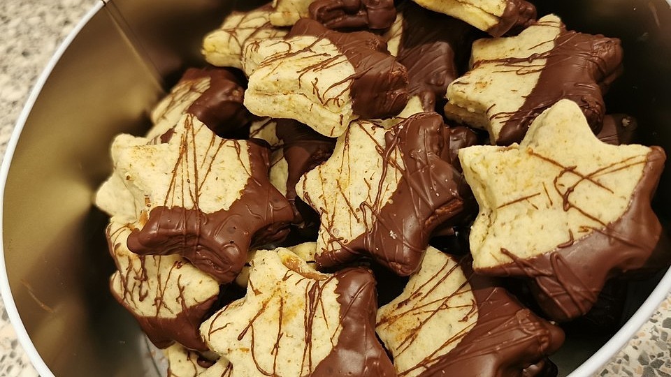 Dann die Blockschokolade im Wasserbad erhitzen und die Plätzchen zur Hälfte diagonal in die Schokolade tauchen.