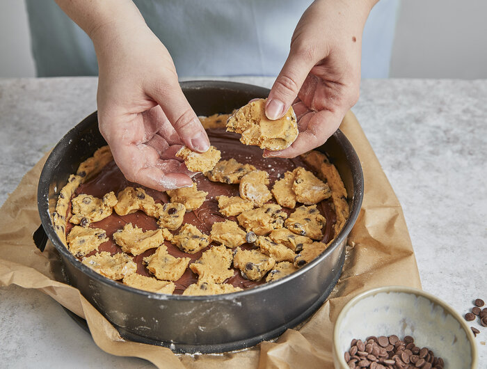 Für den Nutella-Cookie-Kuchen den Boden einer Springform mit Backpapier auslegen.