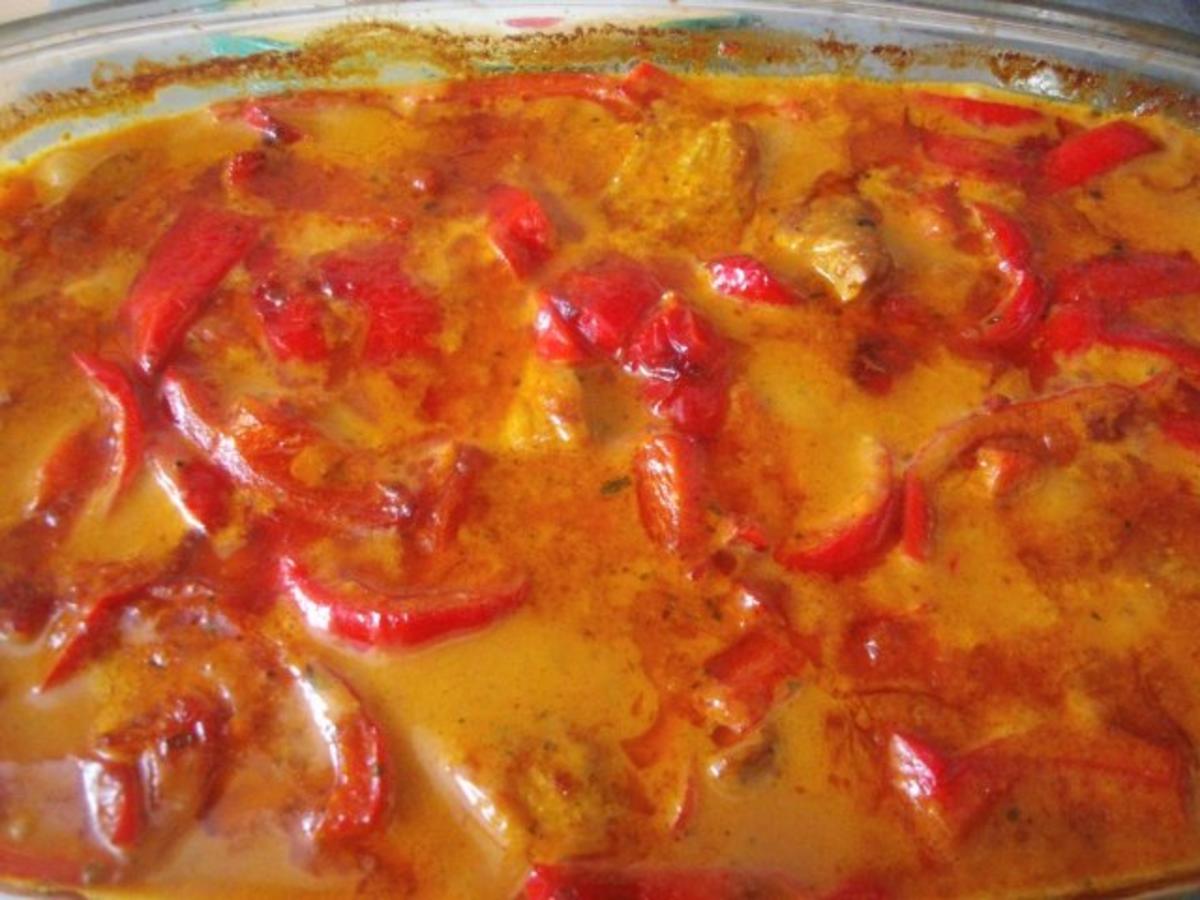 Zwiebeln unter Wenden darin leicht anbräunen, herausnehmen. Paprikastreifen, Knoblauch unter Wenden im Bratfett andünsten. Hälfte der Zwiebeln wieder zufügen, mit Salz, Pfeffer und Chili würzen.