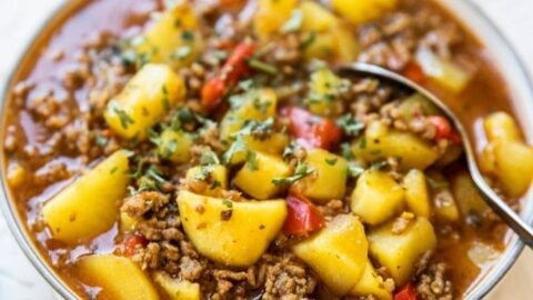 Rinderbrühe und Gewürze hinzugeben und alles mit geschlossenem Deckel für 20 - 30 Minuten köcheln lassen bis die Kartoffeln gar sind. |