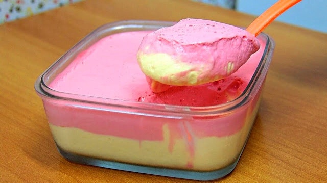 Als nachtes in eine Desserts aufalufform mit ein wenig kalten Wasser ausspülen, nun zuerst den Vanillepudding in die form füllen und dan darauf den Erdbeerpudding streichen. |