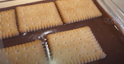 Jetzt eine kleinere Auflaufform nehmen und zuerst Kekse hineingeben, andersrum würde ich nicht unbedingt empfehlen weil man sonst den Pudding nicht mitrausbekommt. Ca. 1/3 vom Schokopudding darüber geben und glatt streichen. Nun wieder Kekse auf die Puddingmasse geben.