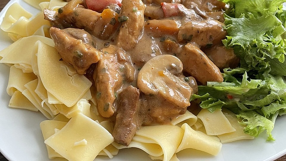Fleisch portionsweiseanbraten. Dann der Reihe nach die Zwiebeln, die Pilze und die Paprika kurz anbraten. Dann das Fleisch wieder dazugeben. Mehl über die gesamte Masse sieben, bis die ganze Oberfläche leicht bedeckt ist. Unter Wenden ca. 2 - 3 Min. anschwitzen. Paprikapulver, Salz und etwas Pfeffer und das Tomatenmark dazugeben und alles nochmal gut vermengen. Das Mehl darf nicht mehr zu sehen sein. Dann die Gemüsebrühe und Milch dazugeben und gut rühren. Den Herd auf kleinste Stufe schalten und die Sahne dazugeben.