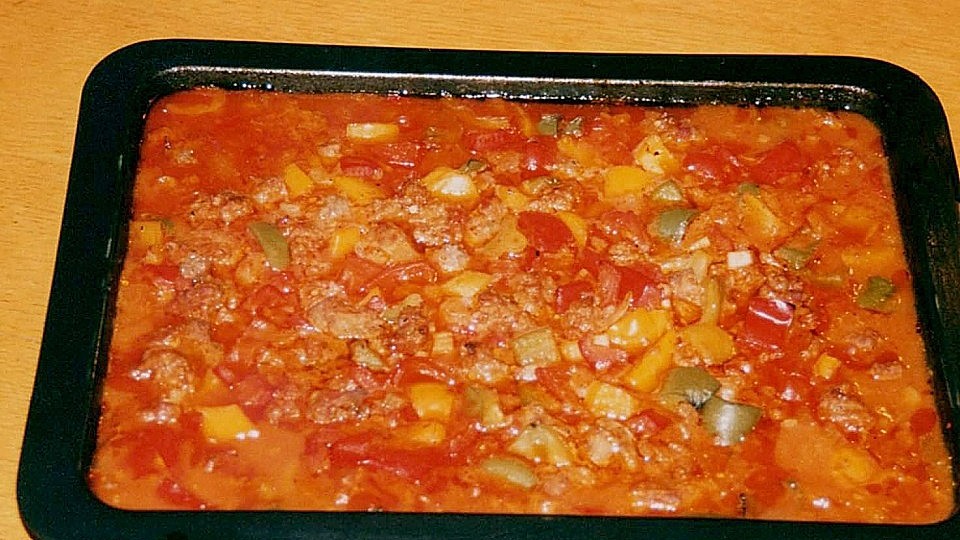 Alle Zutaten nacheinander in eine feuerfeste Form schichten, mit Salz, Pfeffer und Paprikapulver würzen, Chilisauce, Schaschliksauce und Ketchup darüber geben, sowie die Brühe. Bei 200°C im Backofen in 60-90 Minuten