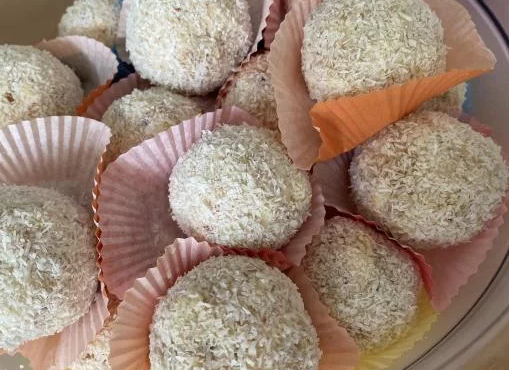 Brösel und Quarkmasse mischen, zu Bällchen formenund in Kokosflocken wenden, evtl. Krokant