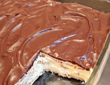 Zuletzt in der Mikrowelle oder im Topf 1 Becher Sahne, die 200 g Schokolade und 2 EL Butter schmelzen, aber nicht kochen lassen und auf der letzten Keksschicht verteilen und glatt streichen. Über Nacht in den Kühlschrank stellen. |