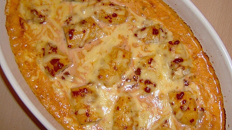 Bananen schälen, halbieren und auf die Filets legen. Sahne mit Tomatenmark, Currypulver und Salz kräftig abschmecken und über die Bananen und das Fleisch gießen. Mit dem geriebenen Käse bestreuen und überbacken.