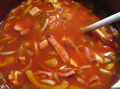 Den Speck anbraten, die gewürfelte Wurst dazugeben (noch nicht die Salami!) und alles schön anbraten. Dann die Salami dazugeben. Kurz weiterbraten, die Zwiebel mit in den Topf geben und weiterbraten, bis die Zwiebeln glasig sind. Falls es ansetzen sollte, ein wenig Wasser dazugeben.