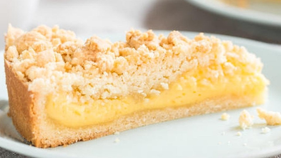 Den Teig in der Springform verteilen und einen Rand von 3 cm hochziehen, den Pudding auf dem Boden verteilen und die krümeligen Streusel darüber geben.