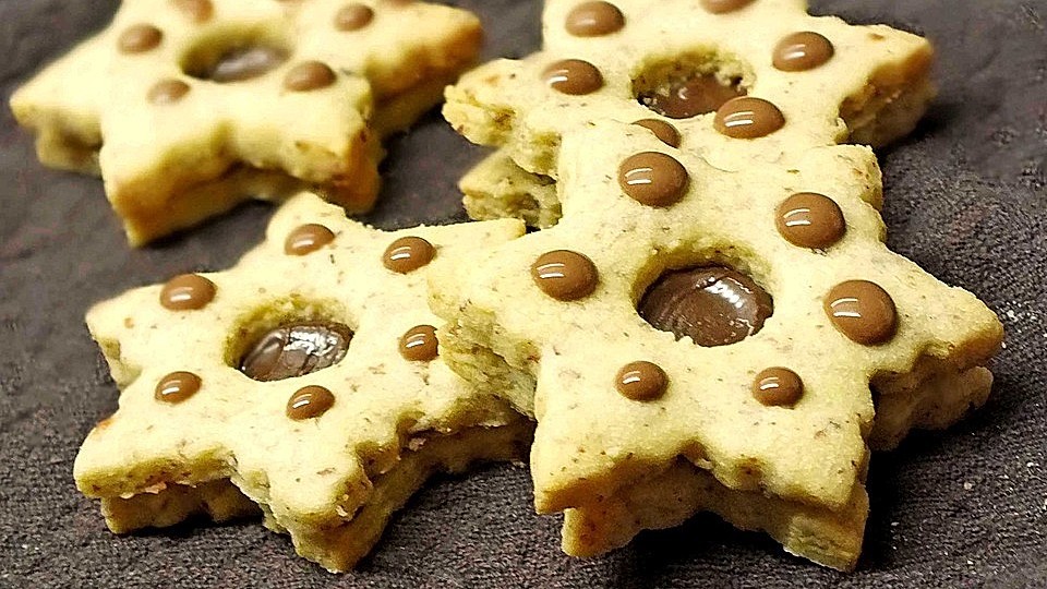 Etwas Nutella auf die Bodenplätzchen streichen und jeweils mit einem Plätzchen mit Loch zusammensetzen und Loch mit Haselnusscreme füllen.